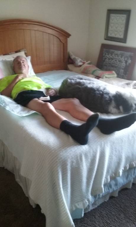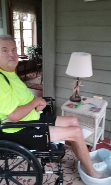 My husband and I are both retired, working at part time jobs. I work as a clerk in the children's department at our city library, and Larry works at the Sunshine Van, dispatching drivers to pick up and deliver seniors to their appointments. A little over six weeks ago, Larry was mowing and his left suddenly flew off of the mower, unable to grasp the steering bar. He shut the mower off, and when tried to stand, his left leg collapsed. He called for me, and I, in turn, called 911. Since his symptoms were those of a stroke, I gave him an aspirin to dissolve in his mouth. The paramedics took him to the local hometown hospital, then he was sent on to Indiana University Methodist Hospital in Indianapolis. He had suffered a hemorrhage in the right side of his brain. He had undergone a radiation treatment for a melanoma three weeks earlier. The vessels around the tumor had ruptured, causing the brain bleed and resulting swelling. After consultation, the neurologists decided that the best course of treatment was to do brain surgery to relieve the pressure and spur healing so the melanoma infusion therapy treatments could be resumed as soon as possible. Following the surgery and post op care, Larry went to an acute rehabilitation facility to help him get ready to go home. He had physical and occupational therapy for three weeks, then was released to go home. I became the caregiver. I was instructed on making transfers from the wheelchair to the bed and commode. We could not transfer him to the car or the shower because Larry is a strapping 6 foot two and a half inches tall, weighing 205 pounds. I am five foot three. He also still had a flaccid arm and leg, the leg being a dead weight. We were not able to receive home health care because he was to continue PT and OT as an outpatient. We have been home for three weeks now, and he finally had his first shower today as our son from out of town came to help and the two of us got him in the shower. If it was not for the Sunshine Van service, we could not get to therapy. They pick us up and take us to the facility. We are to learn transfers to the car and shower soon, and Larry is getting stronger and may be able to help more with those transfers. Other skills that I have had to learn are controlling a diabetic diet, as the medications have thrown Larry into diabetes. I test his blood sugar four times a day and give him four insulin shots. I also give him a daily shot in his stomach area to limit blood clotting. He has ten prescription medications that I administer, and they are given at various times, once, twice, three times a day or at bedtime. He has an ulcer on his tailbone from sitting in the chair, and I recently learned how to dress it. I have had to take an extended leave from my part time job, and we have needed to buy many out of pocket medical supplies to maintain his healing. Taking care of Larry's needs is a full time job, taking the full day. We are often exhausted by nine o'clock and ready for bed. We have appointments with therapy and various doctors several days each week. We are grateful that he has a good prognosis for healing and regaining the use of his arm and leg. I felt totally unskilled to be taking on such a huge responsibility with healthcare. I am happy to do it, as I want Larry to have the best opportunity for healing as possible, but I also am a little insecure as to my abilities as a nurse. I have wished more than once for a helper or a nurse to give me assurance that he is being well cared for. He is a trouper, helping me through my efforts at helping him to be better. I often wonder, what would this look like if we were ten or fifteen years older? I try to do things to help him.
